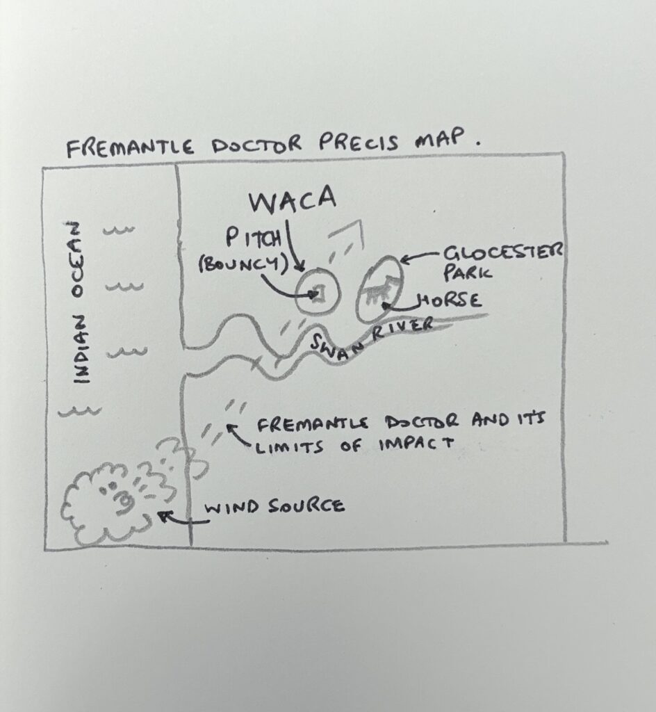 It had not occurred to me that Perth’s afternoon breeze, known as the Fremantle Doctor, famous amongst the cricket following community for disrupting the momentum of a days’ play, was not solely aimed in a narrow beam at the WACA Ground and in operation only on game days.